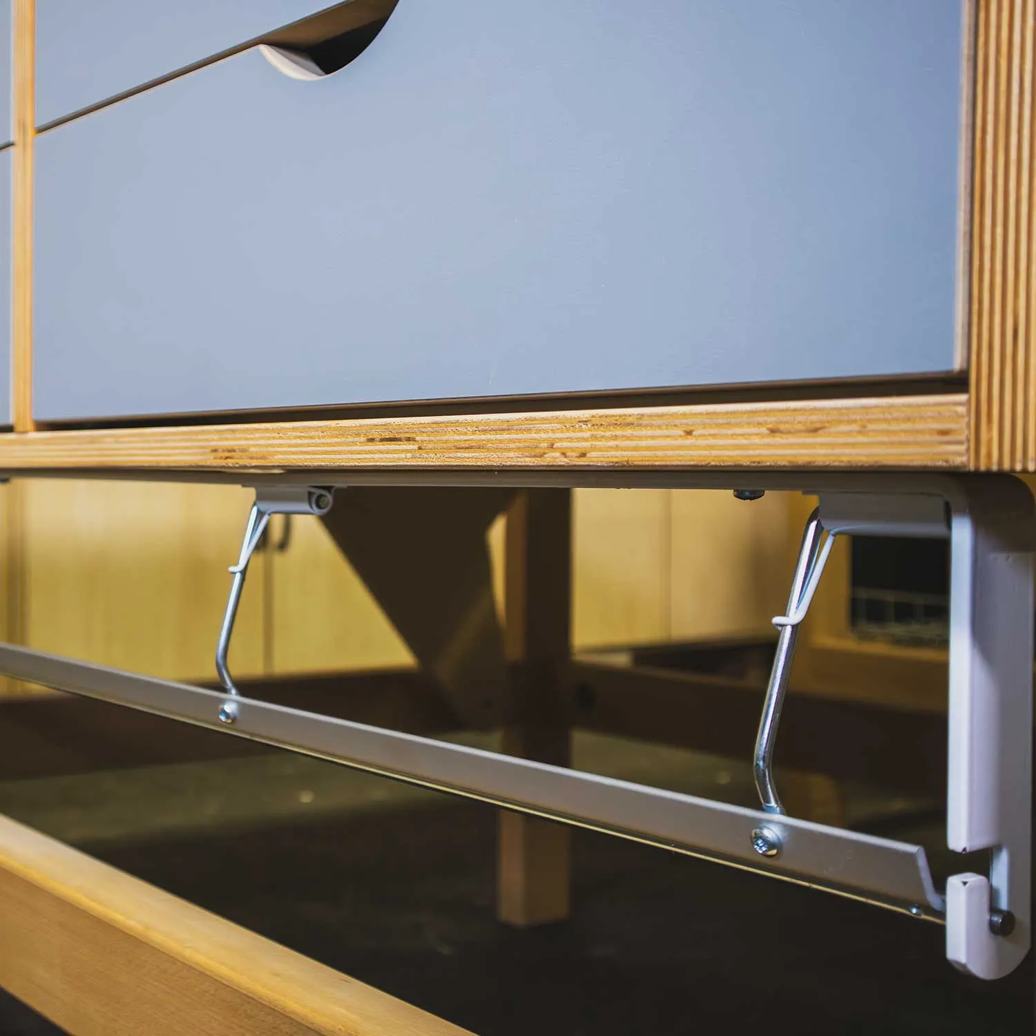 Passt zu Sjöbergs Zuschneidetisch, der mit einem Schubladensatz montiert ist. Kann leicht mit Befestigungsschrauben an der Leiste unterhalb des Schubladensatzes angebracht werden.