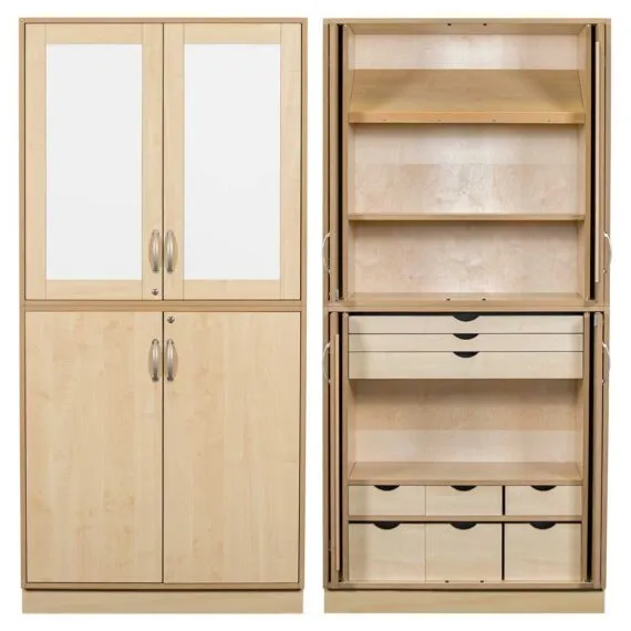Robust und schön für vielfältigen Gebrauch. Um lange Haltbarkeit und Lebensdauer zu gewährleisten, werden Grundmodell samt Einteilung innen aus 19 mm starkem Melamin beschichtet MDF hergestellt. Die Türen lassen sich jeweils in den Öffnungen der Schrankseiten versenken.