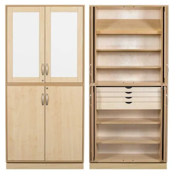 Robust und schön für vielfältigen Gebrauch. Um lange Haltbarkeit und Lebensdauer zu gewährleisten, werden Grundmodell samt Einteilung innen aus 19 mm starkem Birkenholz-Furnier hergestellt. Die Türen lassen sich jeweils in den Öffnungen der Schrankseiten versenken.