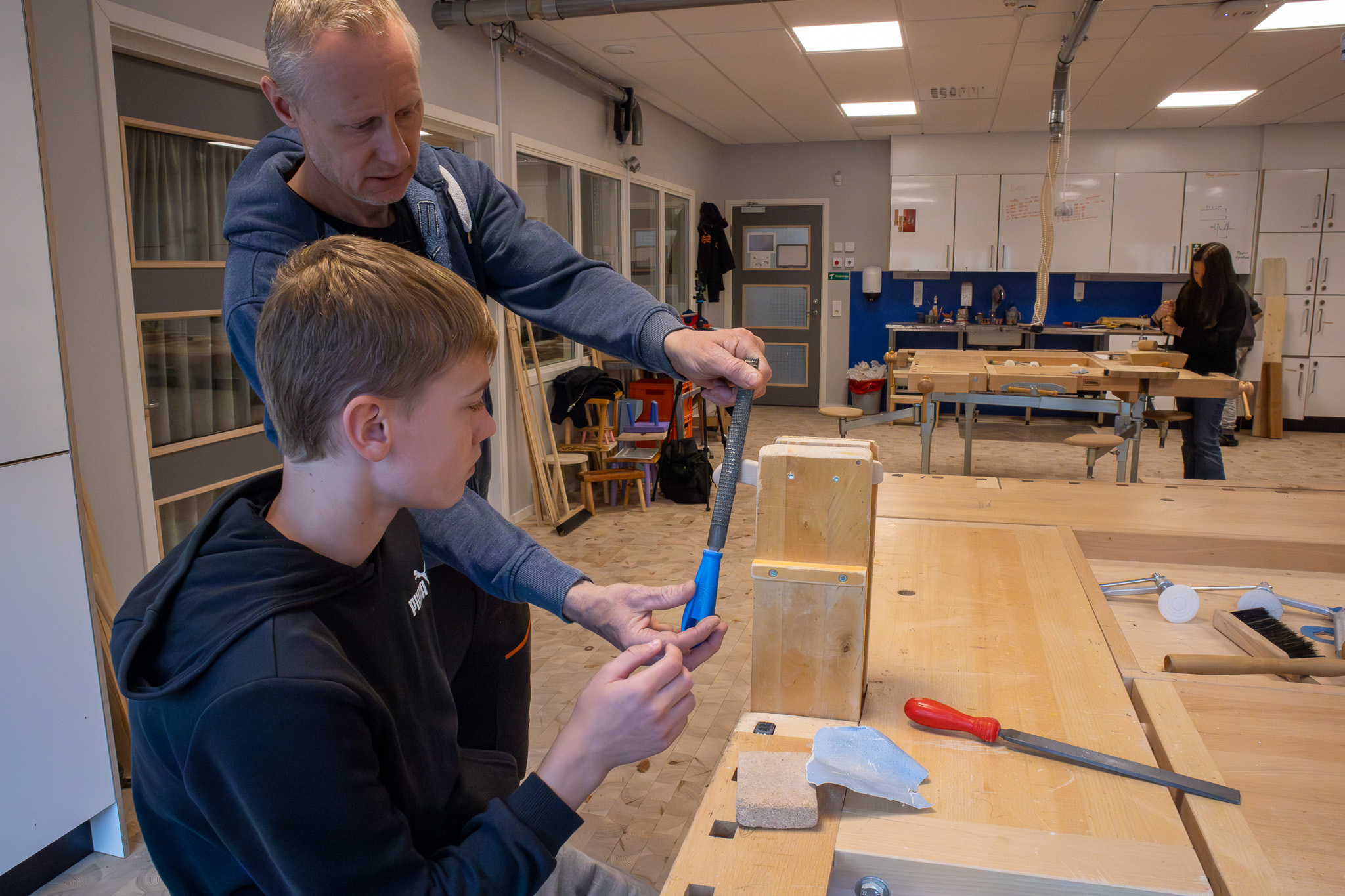I slöjdsalen i Rörvik arbetar han nu med elever från olika årskurser. Femteklassarna driver metall i ett projekt där de tillverkar lampetter – en process Mikael tycker är särskilt spännande att lära ut.
